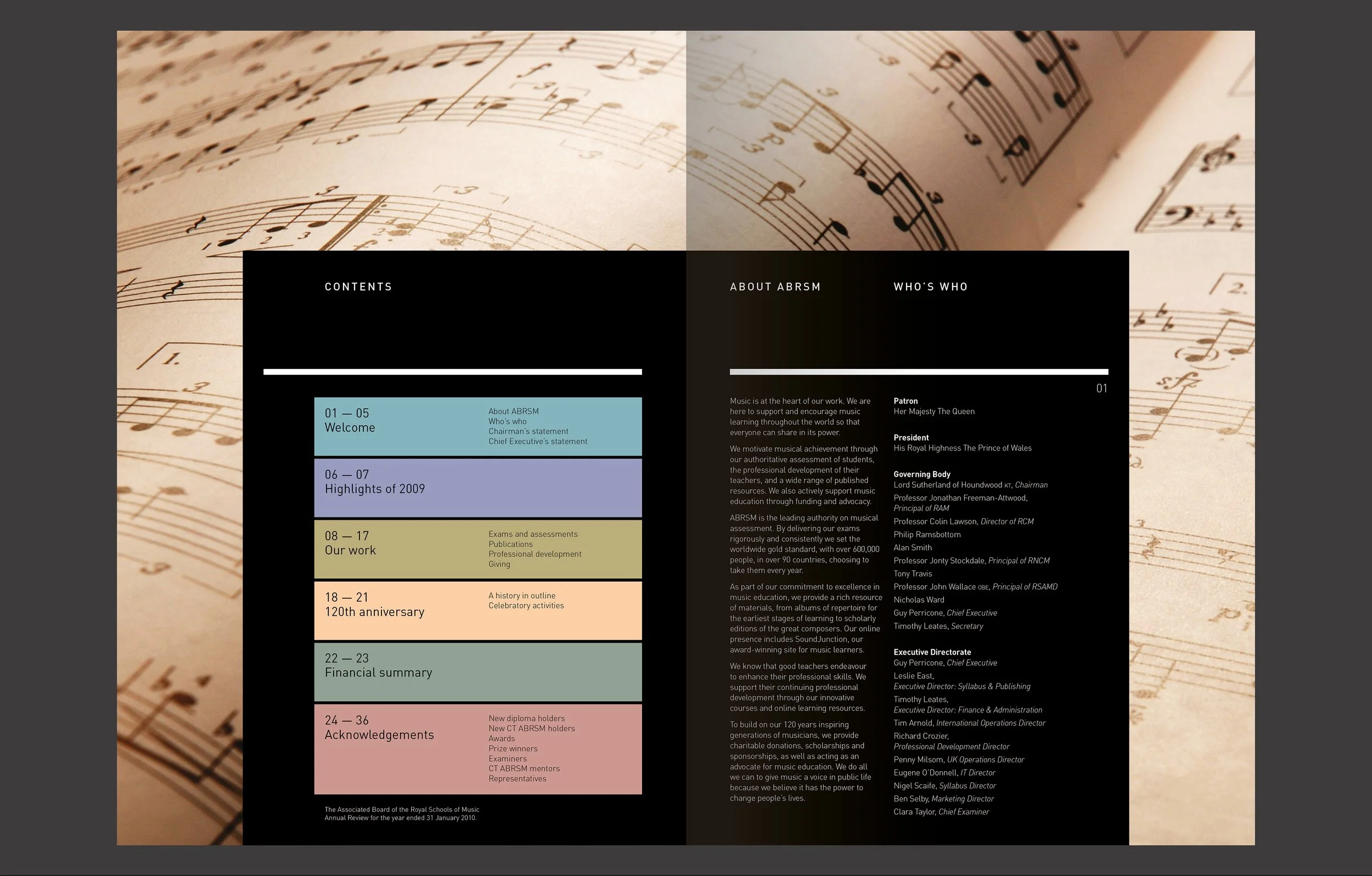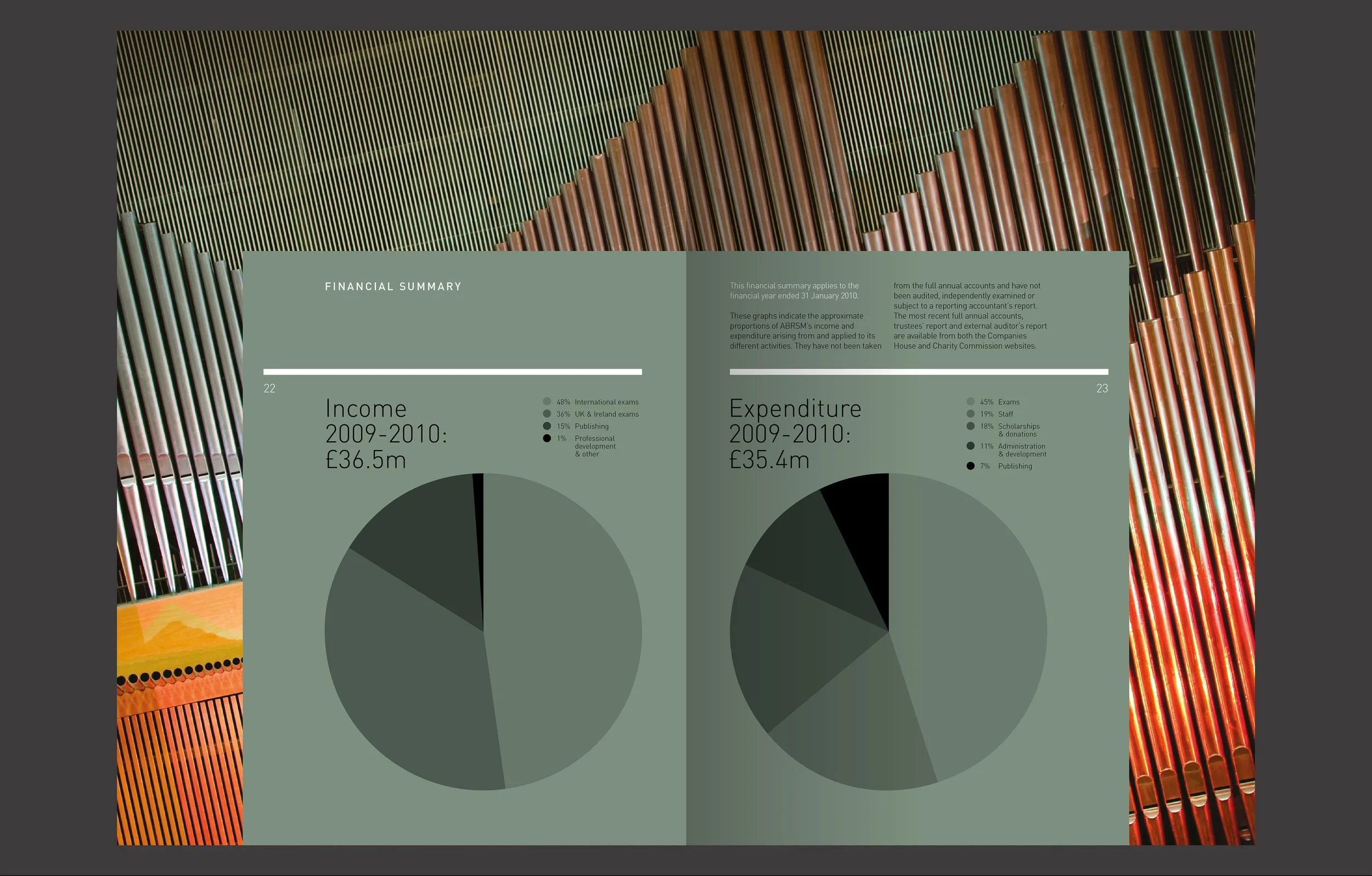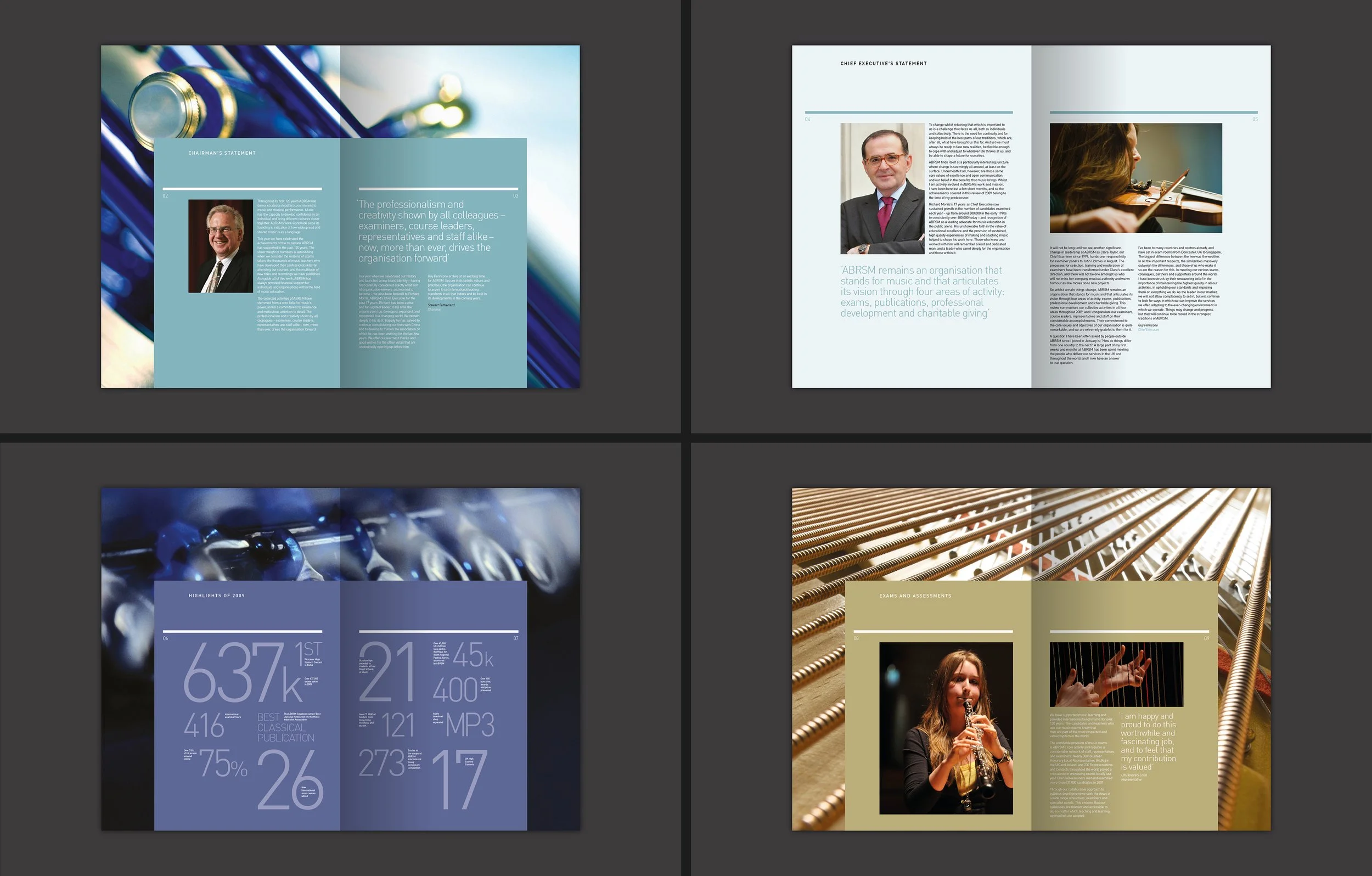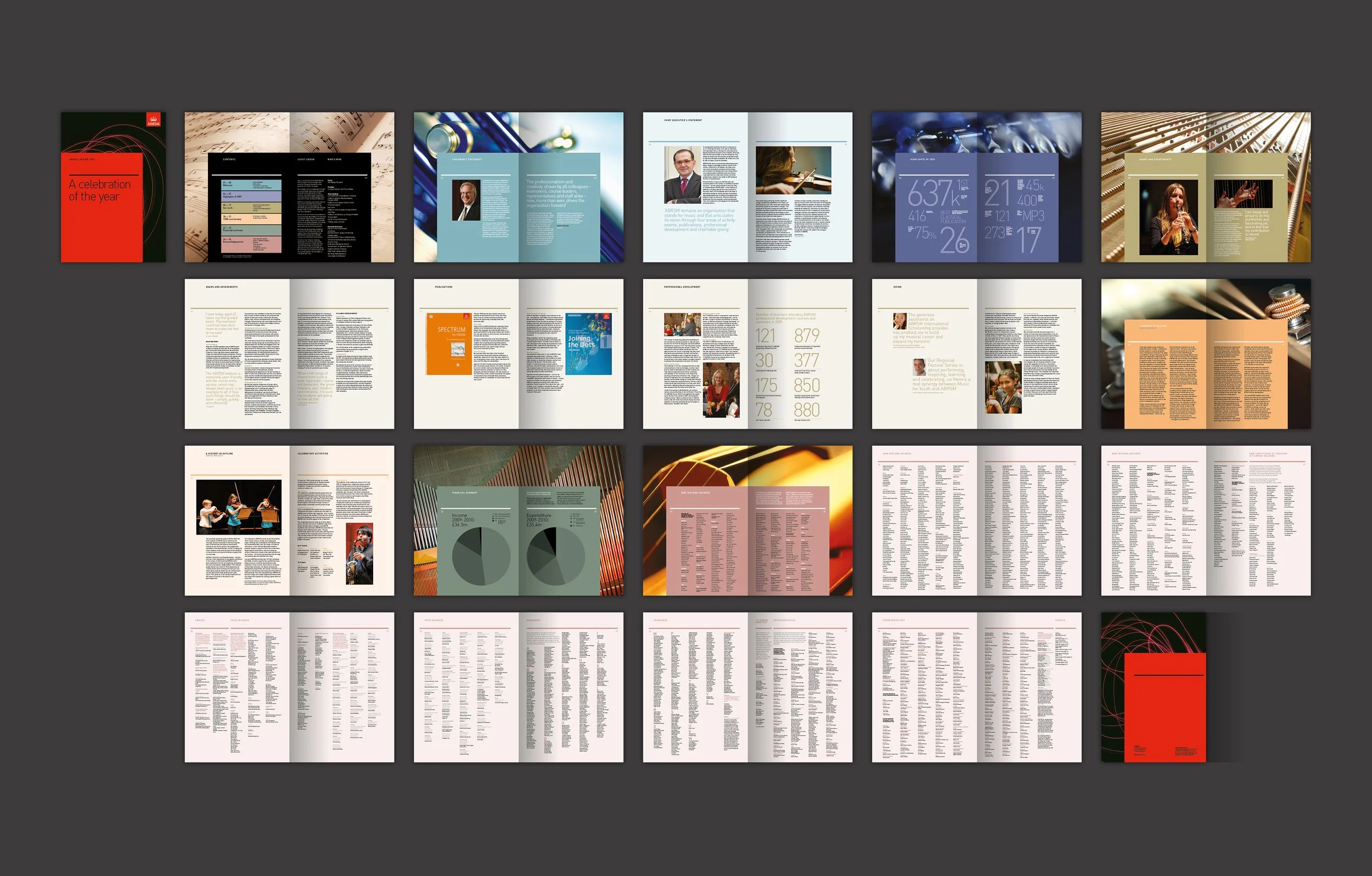 For this years annual report we wanted to reflect this storied passion and profession for music by visually underpinning the report with abstracted musical instruments. Visually this sets the narrative tone of the document to the metaphorical soundtrack of the music.